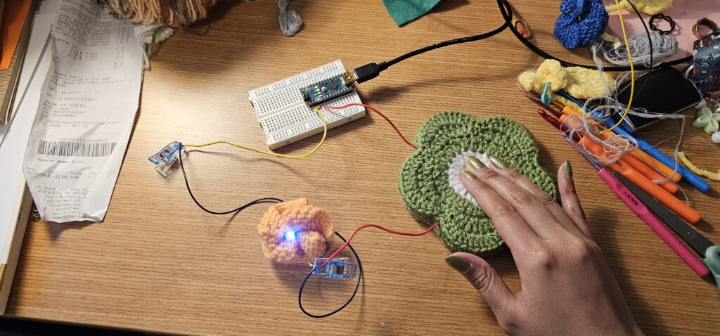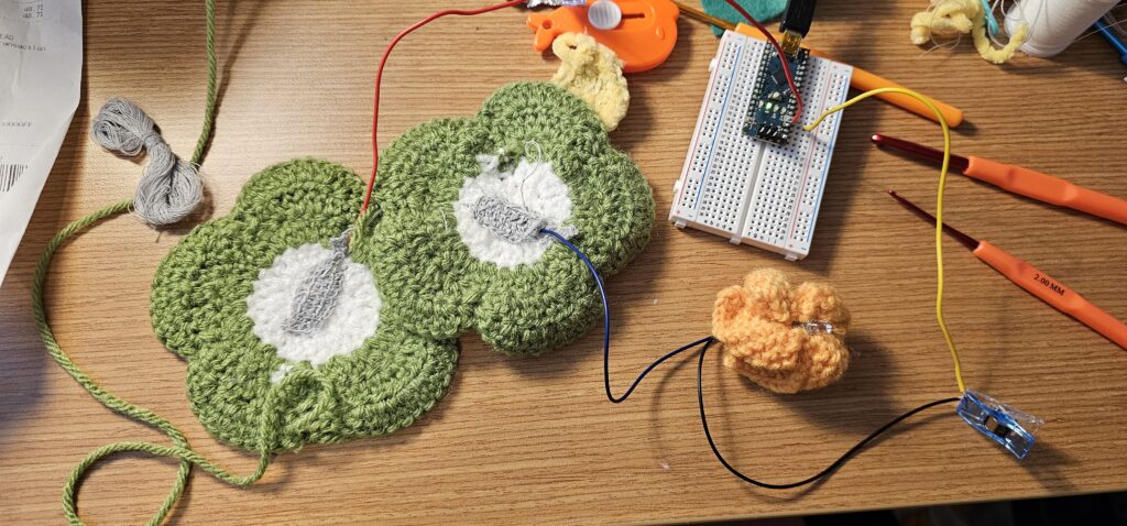 This was a project from my Fabrications Lab class, where we combine textiles arts with technology. I programmed an Arduino to switch on a light when a button was pressed. I crocheted three flowers, one yellow to light up with an LED, and two green ones to be sewed closed and serve as the “button.”